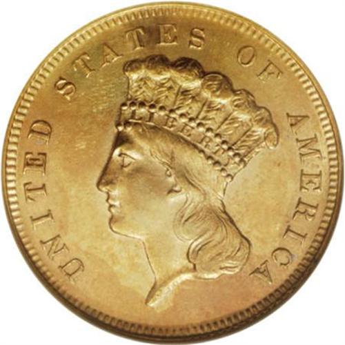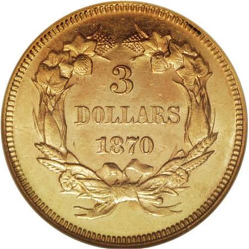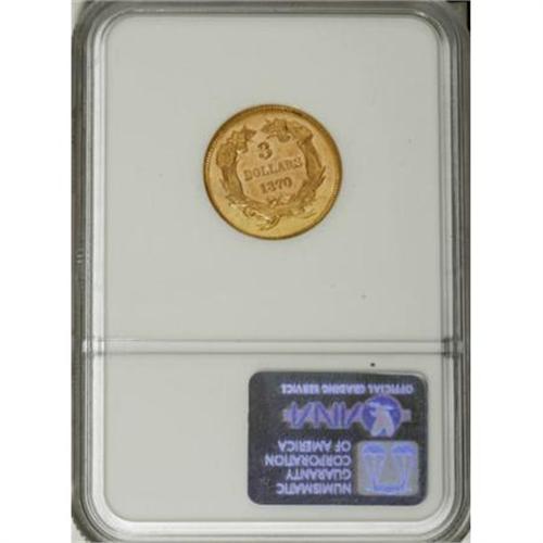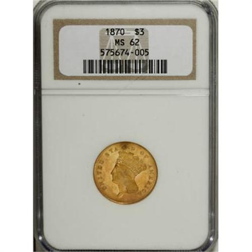 <B>1870 $3 MS62 NGC.</B></I> The 1870 three dollar gold pieces are nearly as rare as 1869, despite the higher mintage of 3,500 coins. Mirrored fields surround frosty devices with distinctive toning at 12 o'clock on the obverse. Hints of pale lilac toning accent the honey-yellow surfaces. Census: 6 in 62, 3 finer (6/07).<BR><I>From The DAX Collection.</B></I><BR><BR><B>Coin Engraver:</B> James B. Longacre<BR><BR><b>Shipping:</b> Coins & Currency (<a target="_blank" href="http://www.heritageauctions.com/common/shipping.php">view shipping information</a>\)