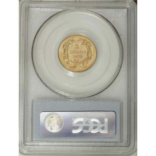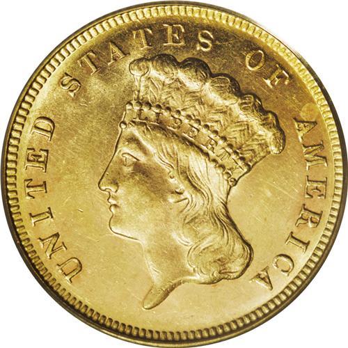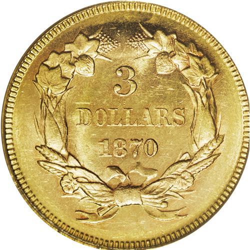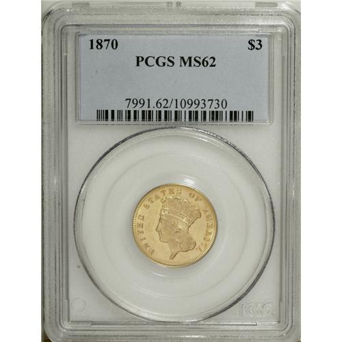 <B>1870 $3 MS62 PCGS.</B></I> Like most examples from the tiny mintage of 3,500 pieces, the fields of this unworn representative display a degree of reflectivity. The strike is solid and the devices are generally clean, though the rest of the surfaces have a number of light abrasions. Population: 14 in 62, 7 finer (12/06).<BR><BR><b>Shipping:</b> Coin/Currency (<a target="_blank" href="http://www.heritageauctions.com/common/shipping.php">view shipping information</a>)