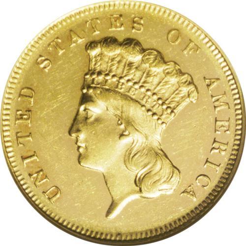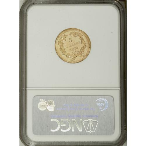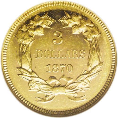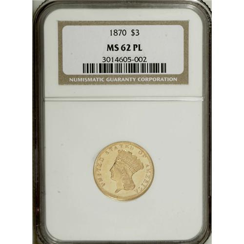 <B>1870 $3 MS62 Prooflike NGC.</B></I> The peach-gold surfaces are highly reflective, with contrasting devices thickly coated with mint frost. Some light abrasions and field chatter noted on either side limit a higher grade, but the eye appeal of this lovely coin is top-drawer. Census: 3 in 62 Prooflike, 0 finer (1/07).<BR><BR><b>Shipping:</b> Coins & Currency (<a target="_blank" href="http://www.heritageauctions.com/common/shipping.php">view shipping information</a>)