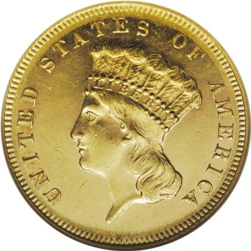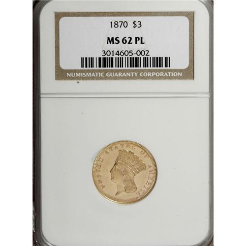 <B>1870 $3 MS62 Prooflike NGC.</B></I> The peach-gold surfaces are highly reflective, with contrasting devices thickly coated with mint frost. Some light abrasions and field chatter noted on either side limit the grade, but the eye appeal of this lovely coin is top-drawer. NGC Census: 3 in 62 Prooflike, 0 finer in Prooflike condition (3/07).<BR><BR><b>Shipping:</b> Coins & Currency (<a target="_blank" href="http://www.heritageauctions.com/common/shipping.php">view shipping information</a>)
