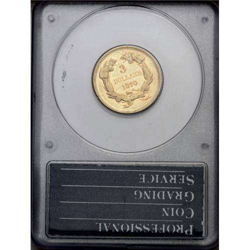 <B>1870<$3> VF35 PCGS.</B></I> An attractive, well circulated low mintage example with hints of peach-apricot patina on the prooflike areas surrounds the protected devices. Housed in a first-generation PCGS holder.