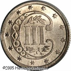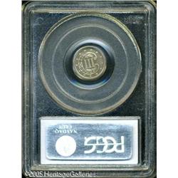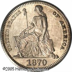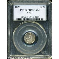 <B>1870 3C Three Cent Silver, Judd-797, Pollock-884, Low R.7, PR65 PCGS.</B></I> A lovely example, in miniature, of Barber's Liberty Seated design, combined with the standard reverse for the three-cent silver coinage. This is an interesting pattern, for the obverse used the same die that was intended for the half dime patterns of this design, while the reverse was a production die for three-cent coinage. The two coinage varieties had diameters that differed by about 1.4 millimeters, meaning that the reverse has an extremely wide border for the size of the coin. This is a lovely Gem with pale heather toning and cameo contrast on the obverse. The reverse is mostly brilliant with just a touch of contrast between the fields and the devices. Lot:9850
