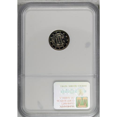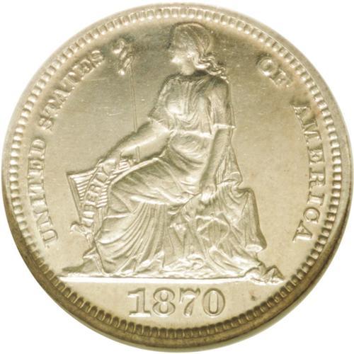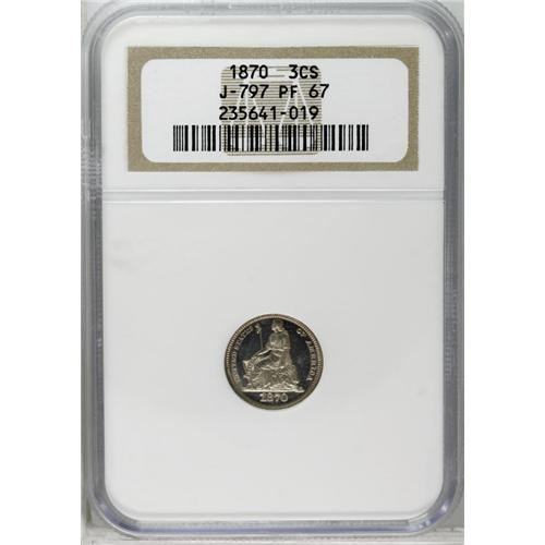 <B>1870<3C> Three Cent Silver, Judd-797, Pollock-884, Low R.7, PR67 NGC.</B></I> A miniature example of Barber's Liberty Seated design, combined with the standard reverse for the three cent silver coinage. This is an interesting pattern, for the obverse used the same die that was intended for the half dime patterns of this design, while the reverse was a production die for three cent coinage. The two coinage varieties had diameters that differed by about 1.4 millimeters, meaning that the reverse has an extremely wide border for the size of the coin. Struck in silver with a reeded edge. Watery, deeply mirrored surfaces are untoned save for traces of rose-golden color overall. This currently the single finest example graded by either service (5/06).