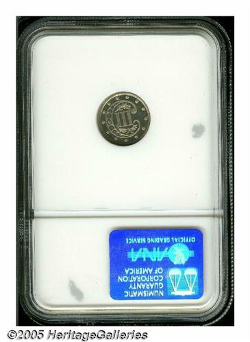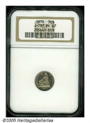 <B>1870<3C> Three Cent Silver, Judd-797, Pollock-884, Low R.7, PR67 PCGS.</B></I> A lovely example, in miniature, of Barber's Liberty Seated design, combined with the standard reverse for the three-cent silver coinage. This is an interesting pattern, for the obverse used the same die that was intended for the half dime patterns of this design, while the reverse was a production die for three-cent coinage. The two coinage varieties had diameters that differed by about 1.4 millimeters, meaning that the reverse has an extremely wide border for the size of the coin. Watery, deeply mirrored surfaces are untoned save for a trace of golden color in the protected areas of the obverse.<BR><I>From The Western Hills Collection.</B></I>