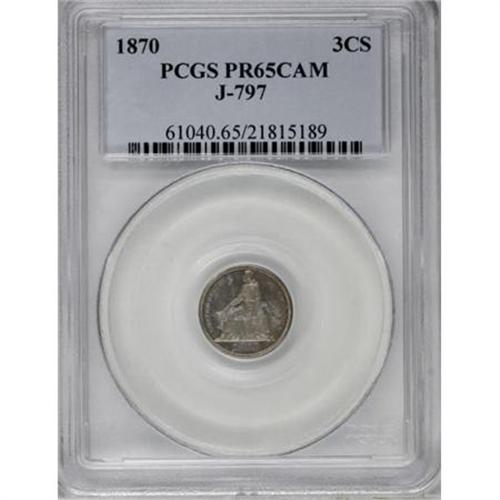 <B>1870 3C Three Cent Silver, Judd-797, Pollock-884, Low R.7, PR65 Cameo PCGS.</B></I> A lovely example, in miniature, of William Barber's Liberty Seated design, combined with the standard reverse for the three-cent silver coinage. Since the obverse die was intended for a half dime, and the two denominations had diameters that differed by about 1.4 millimeters, the reverse has a wide border for the size of the coin. Struck in silver with a reeded edge. Exactingly struck with prominently mirrored fields and a few glimpses of golden-gray toning. Population: 2 in 65, 0 finer (11/07).<BR><I>From The Madison Collection.</B></I><BR><BR><b>Shipping:</b> Coins & Currency (<a target="_blank" href="http://www.heritageauctions.com/common/shipping.php">view shipping information</a>)