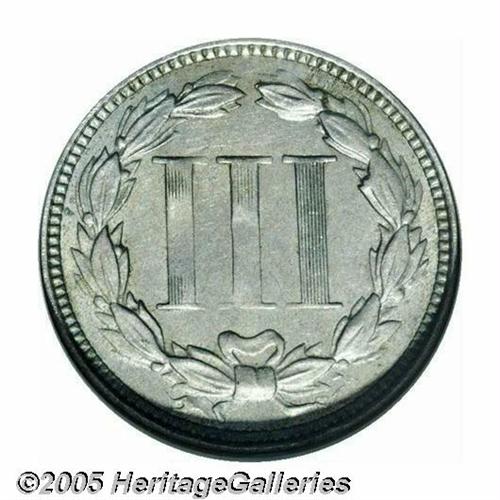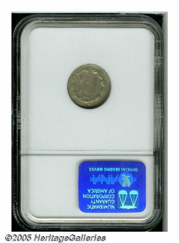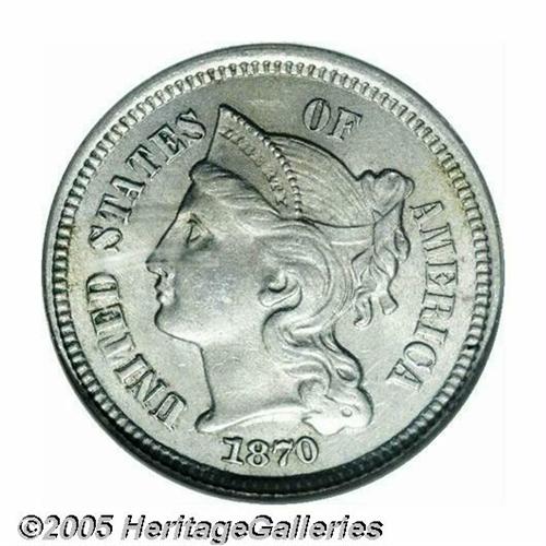 <B>1870<3CN> MS61 NGC.</B></I> 1870/1870, Doubled Die Obverse, FS-005. Doubling is most easily recognized on the date, UNITED, and the final few letters of AMERICA. Lightly toned with a cluster of shallow facial marks.<BR><I>From The Western Hills Collection.</B></I>