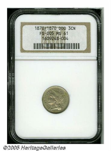 1870 3CN MS61 NGC. 1870/1870, Doubled Die Obverse