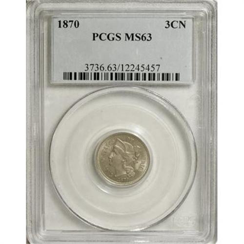 <B>1870 3CN MS63 PCGS.</B></I> PCGS Population (73/160). NGC Census: (51/154). Mintage: 1,335,000. Numismedia Wsl. Price for NGC/PCGS coin in MS63: $165. (#3736)<BR><BR><B>Coin Engraver:</B> James B. Longacre<BR><BR><b>Shipping:</b> Coins & Currency (<a target="_blank" href="http://www.heritageauctions.com/common/shipping.php">view shipping information</a>)