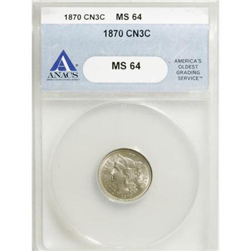 <B>1870 3CN MS64 ANACS.</B></I> NGC Census: (103/49). PCGS Population (88/69). Mintage: 1,335,000. Numismedia Wsl. Price for NGC/PCGS coin in MS64: $245. (#3736)<BR><BR><B>Coin Engraver:</B> James B. Longacre<BR><BR><b>Shipping:</b> Coins & Currency (<a target="_blank" href="http://www.heritageauctions.com/common/shipping.php">view shipping information</a>)