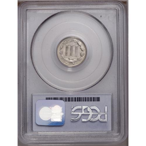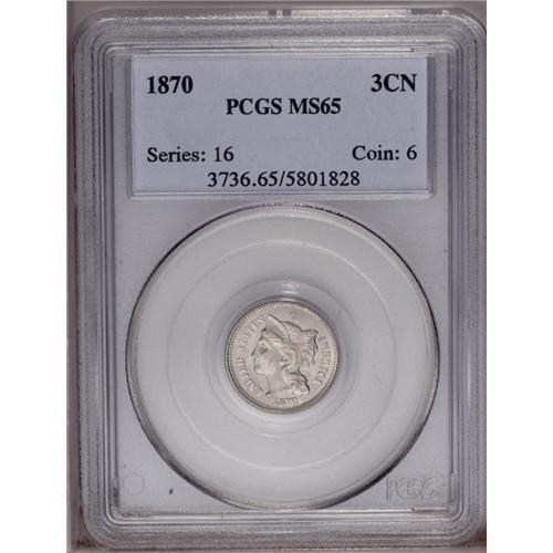 <B>1870<3CN> MS65 PCGS.</B></I> Wisps of olive and steel-blue embrace this lustrous and typically struck Gem. A small obverse planchet flaw near 5:30, but the surfaces are exceptionally smooth. The date is nicely repunched south.