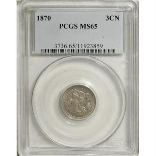 <B>1870 3CN MS65 PCGS.</B></I> . PCGS Population (46/26). NGC Census: (45/6). Mintage: 1,335,000. Numismedia Wsl. Price for NGC/PCGS coin in MS65: $625. (#3736)<BR><BR><B>Coin Engraver:</B> James B. Longacre<BR><BR><b>Shipping:</b> Coins & Currency (<a target="_blank" href="http://www.heritageauctions.com/common/shipping.php">view shipping information</a>)