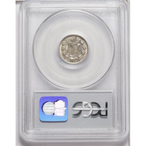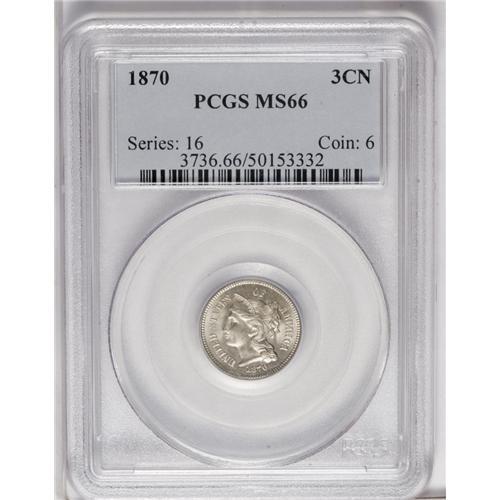 <B>1870<3CN> MS66 PCGS.</B></I> Tied for the finest certified by PCGS. Sharply struck, save for some of the detail on the Roman numerals on the reverse, with brilliant and frosty luster beneath pale gold toning. A delight to behold. Population: 13 in 66; none are finer (2/06).