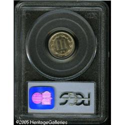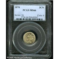 <B>1870 3CN MS66 PCGS.</B></I> Tied for the finest certified by PCGS. Sharply struck with brilliant and frosty luster beneath pale gold toning. A delight. Population: 11 in 66, 0 finer (1/05). Lot:5702