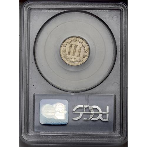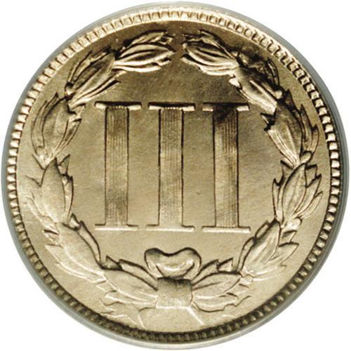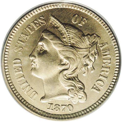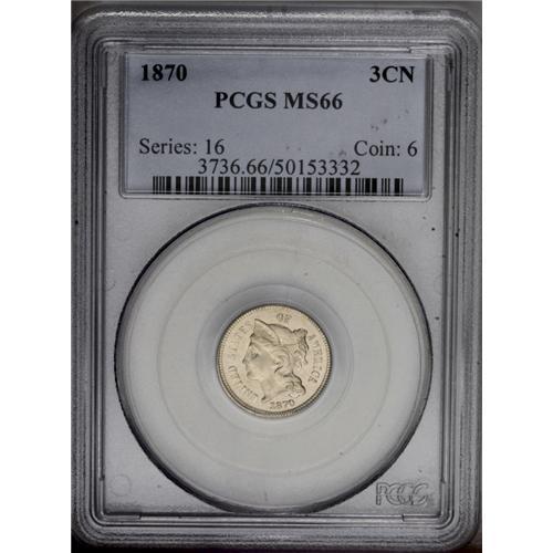 <B>1870<3CN> MS66 PCGS.</B></I> Tied for the finest certified by PCGS. Sharply struck, save for some of the detail on the Roman numerals on the reverse, with brilliant and frosty luster beneath pale gold toning. A delight to behold. Population: 12 in 66, none are finer (2/06).