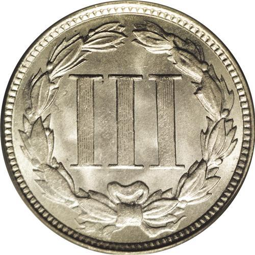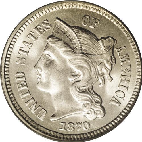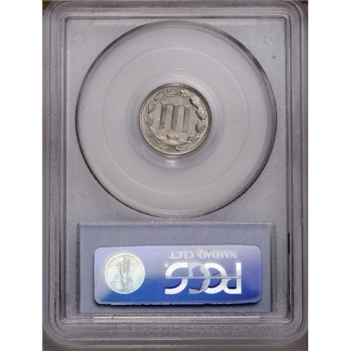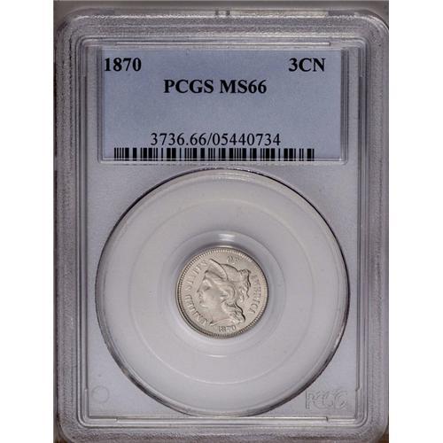 <B>1870<3CN> MS66 PCGS.</B></I> Even, satin-like mint luster with light gray patina is seen over each side of this fairly well brought up premium Gem. Both sides are untoned and just a little weakness is noted on the right Roman numeral. An exceptionally fine example of this early business strike three cent piece. Population: 11 in 66, 0 finer (3/05).