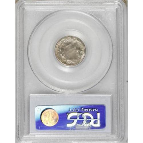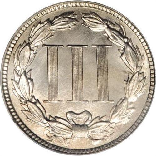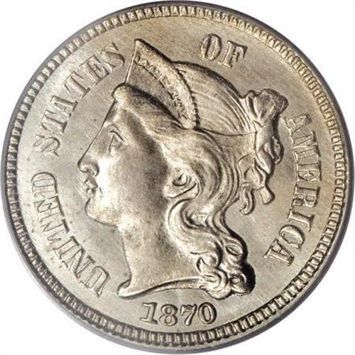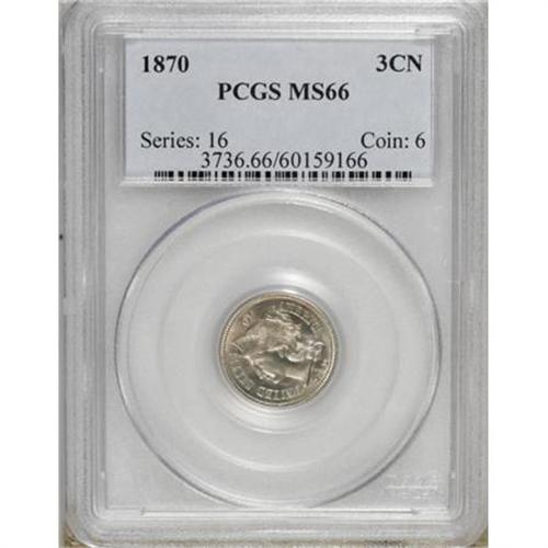 <B>1870 3CN MS66 PCGS.</B></I> A bright, heavily striated Premium Gem with tinges of golden patina over the lower half of the reverse. Trivial carbon freckling on the obverse is more an assurance of originality than a hindrance to this unusually well preserved example. Population: 26 in 66, 0 finer (12/07).<BR><BR><B>Coin Engraver:</B> James B. Longacre<BR><BR><b>Shipping:</b> Coins & Currency (<a target="_blank" href="http://www.heritageauctions.com/common/shipping.php">view shipping information</a>)