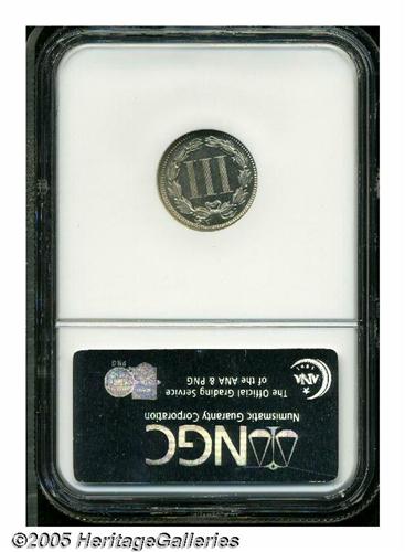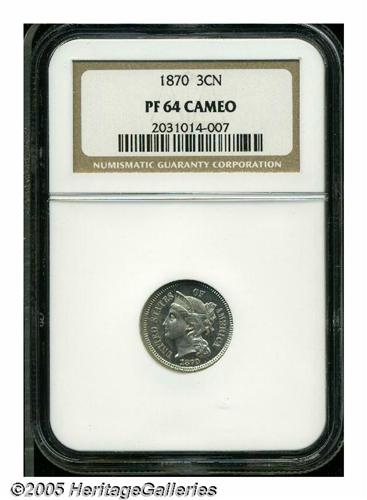 <B>1870<3CN> PR64 Cameo NGC.</B></I> An intricately struck near-Gem with detectable white on black contrast and a not inordinate number of tiny toning flecks. Population: 4 in 64 Cameo, 27 finer (5/05).