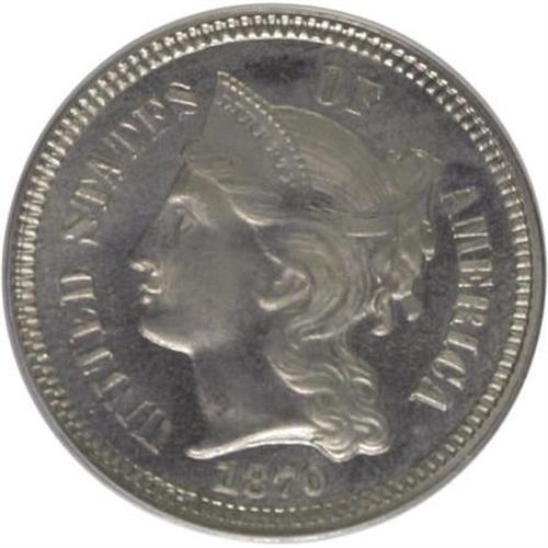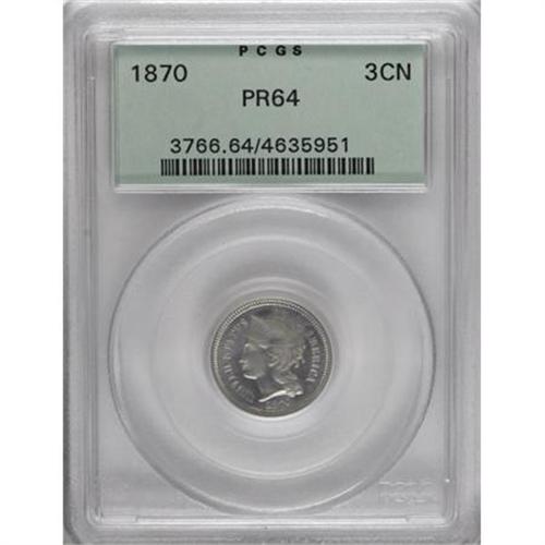 <B>1870 3CN PR64 PCGS.</B></I> PCGS Population (118/67). NGC Census: (97/93). Mintage: 1,000. Numismedia Wsl. Price for NGC/PCGS coin in PR64: $400. (#3766)<BR><BR><B>Coin Engraver:</B> James B. Longacre<BR><BR><b>Shipping:</b> Coins & Currency (<a target="_blank" href="http://www.heritageauctions.com/common/shipping.php">view shipping information</a>)