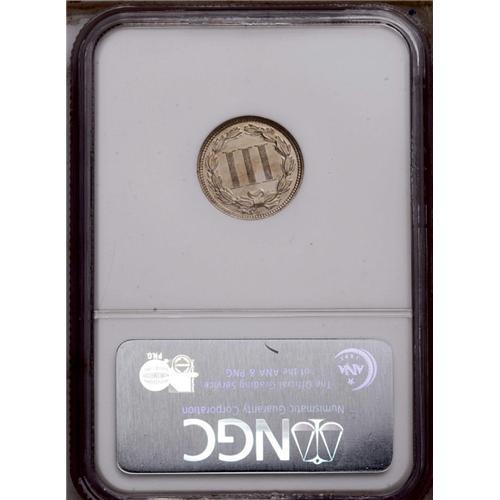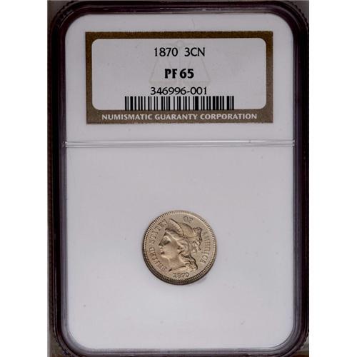 <B>1870<3CN> PR65 NGC.</B></I> A well struck Gem that has light golden-rose patina. Immaculately preserved, a few degrees of counterclockwise die rotation is noted.