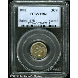 <B>1870 3CN PR65 PCGS.</B></I> A layer of champagne-gold patina is imbued with pastel crimson, blue, and orange colors, especially in the central areas. Well defined, with no notable abrasions.<BR><I>From The Mike Jacobson Collection.</B></I> Lot:5727