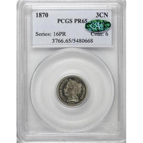 <B>1870 3CN PR65 PCGS. CAC.</B></I> A mild cameo effect enhances the attractive surfaces of this silver-gray Gem, one of only 1,000 pieces struck. Population: 61 in 65, 7 finer (1/08).<BR><I>From The Southwest Collection.</B></I><BR><BR><B>Coin Engraver:</B> James B. Longacre<BR><BR><b>Shipping:</b> Coins & Currency (<a target="_blank" href="http://www.heritageauctions.com/common/shipping.php">view shipping information</a>)