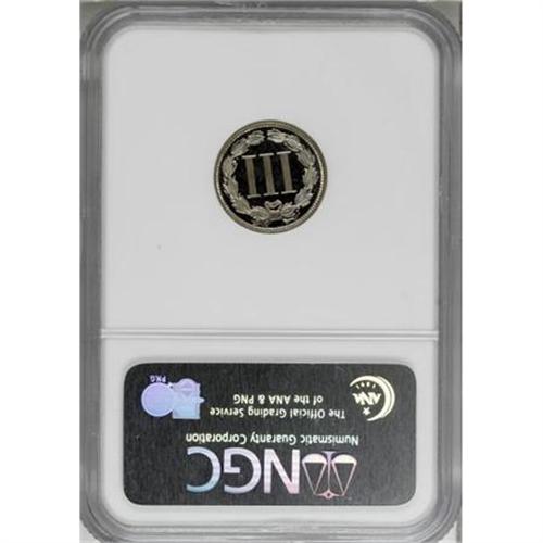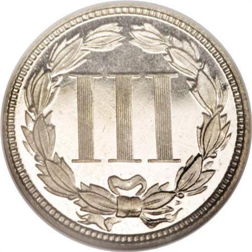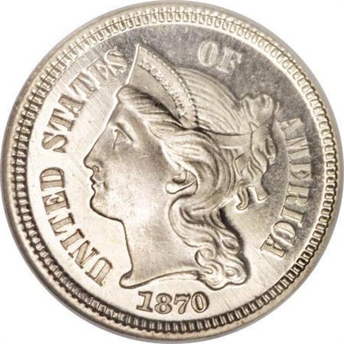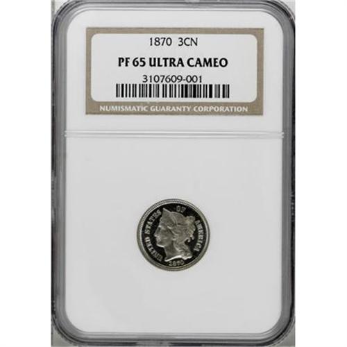 <B>1870 3CN PR65 Ultra Cameo NGC.</B></I> This is the <I>only</B></I> Ultra Cameo specimen certified by NGC (3/08), and a single glance at this outstanding Gem proves that the designation is richly deserved. Delicate blue and canary-yellow shadings grace the gleaming, powerful mirrors, and the boldly impressed devices offer impressive frost. A single point of contact to the left of Liberty's nose precludes an even finer designation.<BR><BR><b>Shipping:</b> Coins & Currency (<a target="_blank" href="http://www.heritageauctions.com/common/shipping.php">view shipping information</a>)