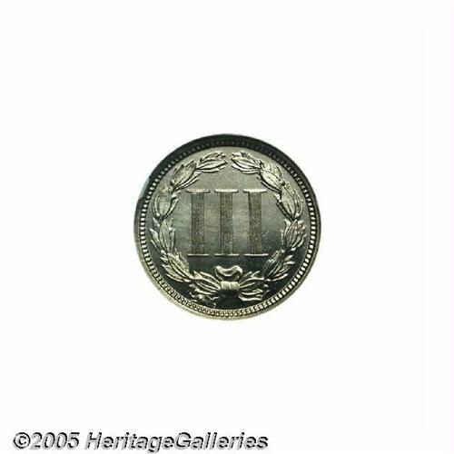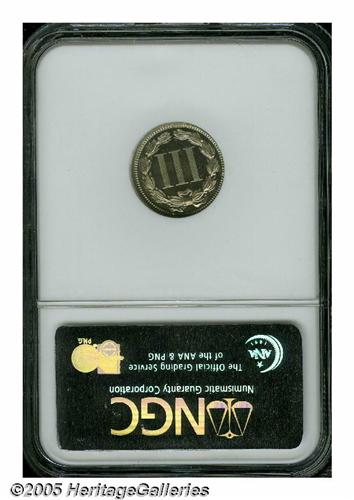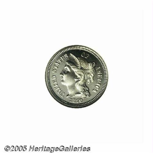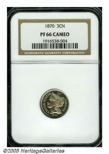 <B>1870<3CN> PR66 Cameo NGC.</B></I> A fully brilliant, well contrasted specimen that is free of outwardly distracting blemishes. Microscopic imperfections on Liberty's portrait are as the coin was struck. Population: 13 in 66 Cameo, 3 finer (6/05).