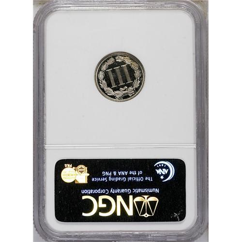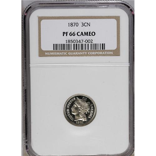 <B>1870<3CN> PR66 Cameo NGC.</B></I> Light tan-gold toning endows this prominently mirrored and decisively struck Premium Gem. The wreath and portrait exhibit dramatic frost. A few tiny flyspecks and strike-throughs deny perfection. Pre-1878 proof three cent nickels are invariably scarce in high grades. Census: 14 in 66 Cameo, 3 finer (8/06).