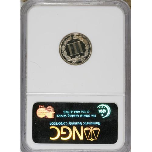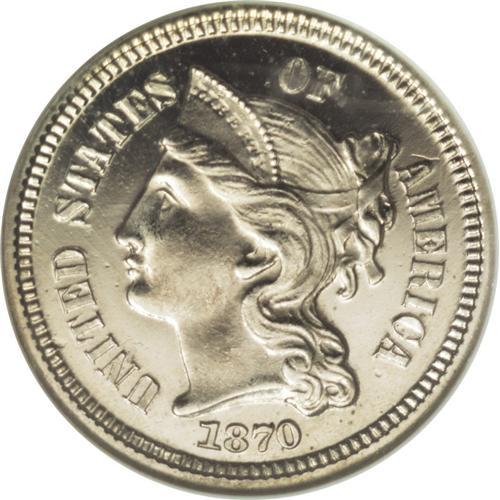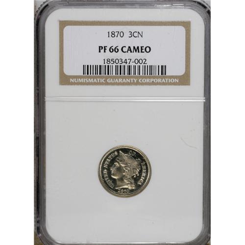 <B>1870 3CN PR66 Cameo NGC.</B></I> Light tan-gold toning endows this prominently mirrored and decisively struck Premium Gem. The wreath and portrait exhibit dramatic frost. A few tiny flyspecks and strike-throughs deny perfection. Pre-1878 proof three cent nickels are invariably scarce in high grades. Census: 15 in 66 Cameo, 3 finer (2/07).<BR><BR><b>Shipping:</b> Coins & Currency (<a target="_blank" href="http://www.heritageauctions.com/common/shipping.php">view shipping information</a>)