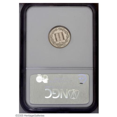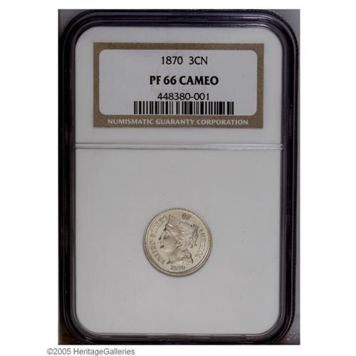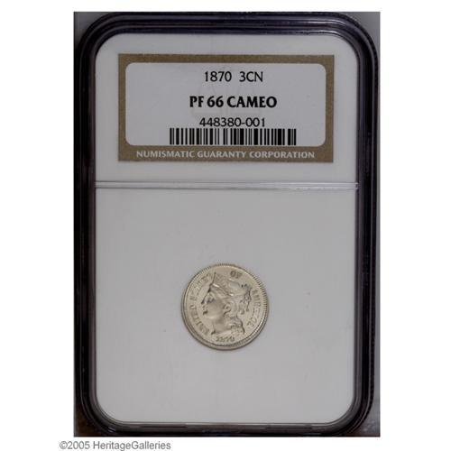 <B>1870<3CN> PR66 Cameo NGC.</B></I> The attractive cameo surfaces reveal nice contrast and are completely untoned and free of any mentionable abrasions. A few defects on Liberty's cheek are from an incomplete strike. Population: 14 in 66 Cameo, 3 finer (10/05).