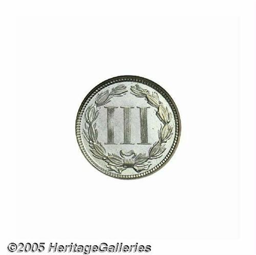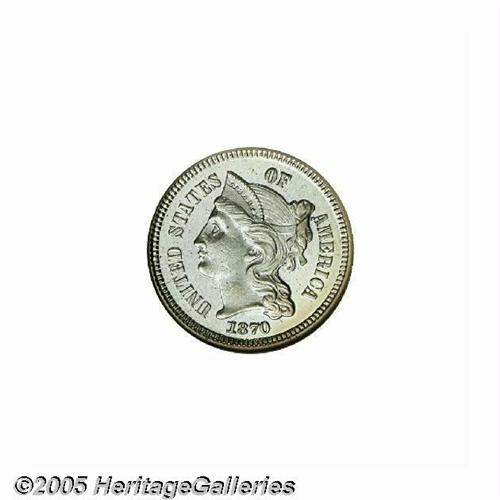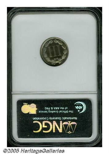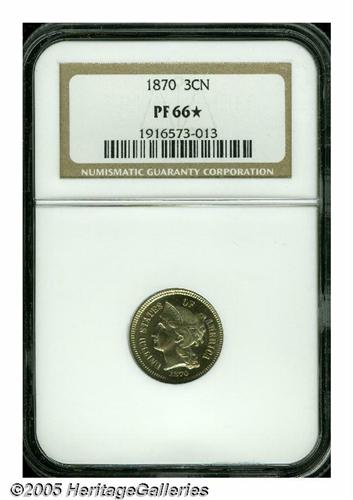 <B>1870<3CN> PR66 <S NGC.</B></I> Sky-blue, lemon, and lime colors invigorate this lustrous high grade 1870 Three Cent Nickel. Well struck except for the center of the first denominational pillar. Although proofs of the denomination have relatively high mintages late in the series, the initial proof issues of the type have smaller mintages and are scarce in finer grades.