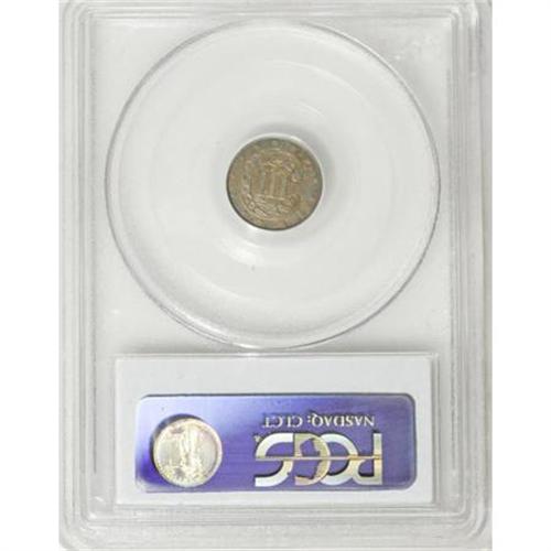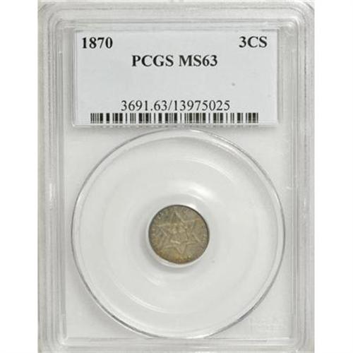 <B>1870 3CS MS63 PCGS.</B></I> The late era of silver three cent pieces, beginning about 1863 and continuing to the end of the series, is noted for the existence of many proofs but few Mint State coins. This piece is a pleasing, deeply toned, with underlying brilliance. Population: 7 in 63, 27 finer (12/07).<BR><BR><B>Coin Engraver:</B> James B. Longacre<BR><BR><b>Shipping:</b> Coins & Currency (<a target="_blank" href="http://www.heritageauctions.com/common/shipping.php">view shipping information</a>)