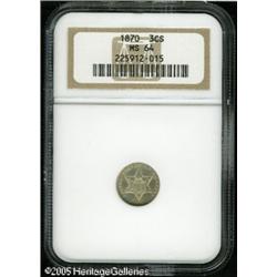 <B>1870 3CS MS64 NGC.</B></I> The 1870 is a low total production year for the three cent silver with only 3,000 business strikes produced along with 1,000 proofs. This is a brilliant example that has reflective fields, but it lacks the profound depth of reflectivity seen on proofs. Fully struck and problem-free. Lot:5667