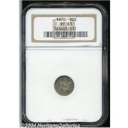 <B>1870<3CS> PR63 NGC.</B></I> A crisply struck piece that has blushes of tan-gray patina and a few unimportant blemishes. Business strikes and proofs combined for just 4,000 pieces in 1870, since the series was made unnecessary by the Three Cent Nickel and Fractional Currency. <BR><BR><B>Important notice:</B> Heritage usually auctions material at the rate of 200-250 lots per hour. On some occasions eBay Live bid software or the Internet may not be able to keep up with the pace of the auction. We recommend placing a realistic absentee bid now as insurance to avoid disappointment. Occasionally the auctioneer may eliminate or reject an eBay Live bid, and the auctioneer may also reopen a lot after the close of the eBay live bidding (usually because we missed an audience bid), and may reject your bid even if it shows you as the winning bidder. By bidding via eBay Live, you agree that Heritage may award the lot to another bidder at its sole discretion under the circumstances described above or any other reasonable circumstances. Since eBay bids are not shown to us until we open the lot on the floor, we treat those bids just like floor bids. In most cases the floor responds before the eBay bid is presented to us, due to Internet lag time, so for consistency we have made it a policy that floor bids are always considered first over tie eBay live bids. Also please note that all Heritage lots purchased through eBay Live carry a 20% Buyer's Premium. Please make sure you read the Terms and Conditions before you bid.