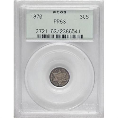 <B>1870 3CS PR63 PCGS.</B></I> PCGS Population (88/129). NGC Census: (39/143). Mintage: 1,000. Numismedia Wsl. Price for NGC/PCGS coin in PR63: $436. (#3721)<BR><BR><B>Coin Engraver:</B> James B. Longacre<BR><BR><b>Shipping:</b> Coins & Currency (<a target="_blank" href="http://www.heritageauctions.com/common/shipping.php">view shipping information</a>\)