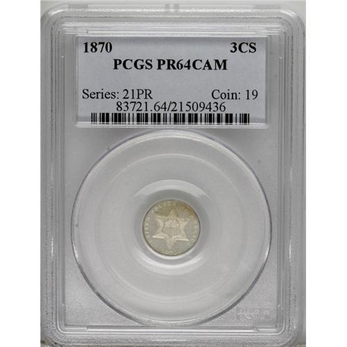1870 3CS PR64 Cameo PCGS. This gorgeous proof has ivor