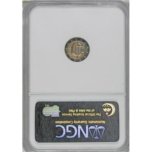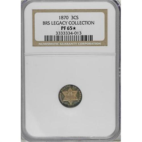 <B>1870 3CS PR65 </B></I><img src="/images/star.gif" width="10" height="10" alt="" border="0"><B> NGC.</B></I> Ex: BRS Legacy Collection. Vibrant green-gold, peach, and sapphire patina enlivens the gleaming surfaces of this gorgeous late-date proof Gem trime. Boldly impressed and beautifully preserved. Of the 35 pieces certified at this level by NGC, only this specimen has received the Star Designation (11/07).<BR><BR><B>Coin Engraver:</B> James B. Longacre<BR><BR><b>Shipping:</b> Coins & Currency (<a target="_blank" href="http://www.heritageauctions.com/common/shipping.php">view shipping information</a>)