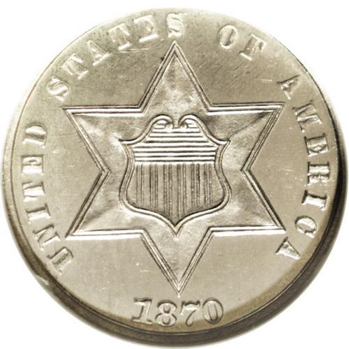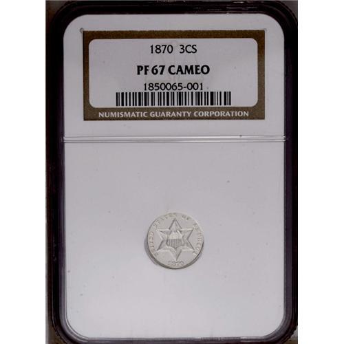 <B>1870<3CS> PR67 Cameo NGC.</B></I> This is one of the most beautiful and eye appealing examples of this issue that we have encountered. The surfaces are essentially untoned with deeply mirrored fields and frosty devices, just missing the Ultra Cameo designation in our opinion. Tied for the finest Cameo proof certified by either PCGS or NGC. Census: 2 in 67 Cameo, 0 finer (6/06).