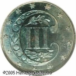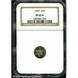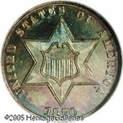 <B>1870 3CS PR67 <img border='0' src='http://www.heritagecoins.com/images/star.gif' width=10 height=10> NGC.</B></I> Rarely seen as a business strike, making the proofs of this year all the more desirable as an alternative for date collectors. Almost flawless watery surfaces exhibit gentle shadings of turquoise-blue and reddish-rose color on each side. Population: 6 in 67, 0 finer (1/05). Lot:5682