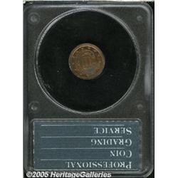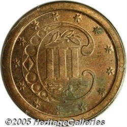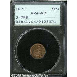 <B>1870 3CS Three Cent Silver, Judd-798, Pollock-885, R.7, PR64 Red PCGS.</B></I> The obverse design, attributed to William Barber, features a seated figure of Liberty facing left and supporting a shield in her right hand, an olive branch in her left. A free-standing liberty pole is present behind the shield. The reverse is the same die as was used to coin regular issue Three Cent Silver pieces. Struck in copper with a plain edge. Watery golden-red surfaces exhibit patchy discoloration on each side, otherwise being of Gem quality. Housed in an early PCGS holder.