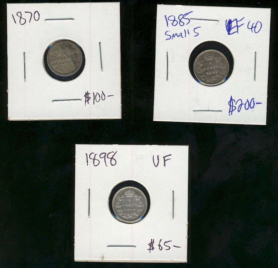 1870 5¢, 1885 Sm & 1898. Lot of 3 coins VF or better.