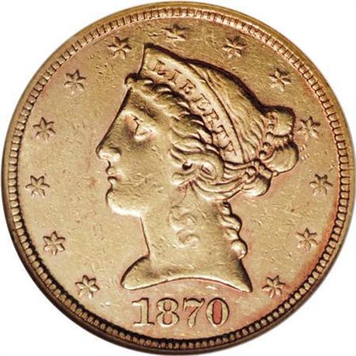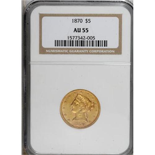 <B>1870 $5 AU55 NGC.</B></I> Boldly struck and moderately worn, with flashes of red-orange luster near some of the devices. A mere 4,035 half eagles were produced at the Philadelphia Mint in 1870, and survivors are scarce at any grade level. A pleasing Choice AU example. Census: 15 in 55, 11 finer (9/07).<BR><BR><B>Coin Engraver:</B> Christian Gobrecht<BR><BR><b>Shipping:</b> Coins & Currency (<a target="_blank" href="http://www.heritageauctions.com/common/shipping.php">view shipping information</a>)