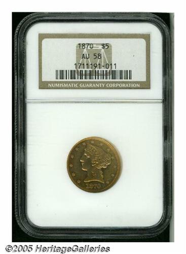 1870 $5 AU58 NGC. Just 4,000 business strikes wer