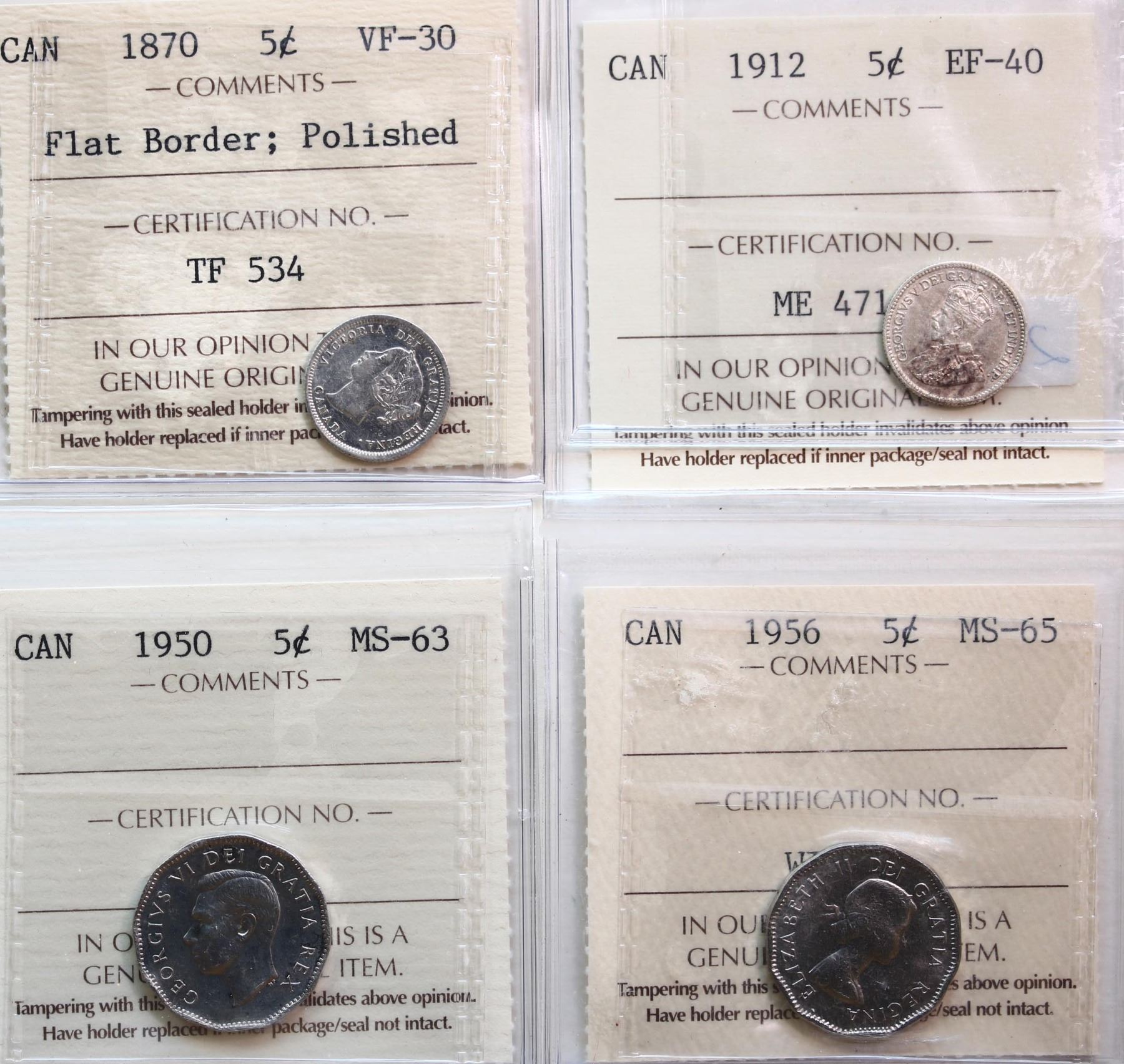 1870 5¢ "Flat Border; Polished", 1912, 1950, 1956. Lot of 4 coins ICCS Choice Very Fine-30 to Gem Mint State-65