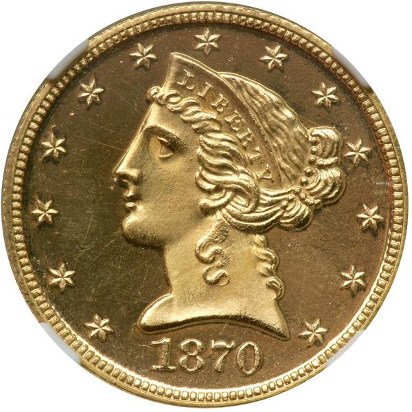 1870. NGC graded Proof 66 Cameo. A marvelous gem example with full glittering mirror surfaces against well frosted raised devices and all untoned. A rare low mintage date as a mere 4,000 were struck for general circulation and only 35 Proofs were made. Housed in NGC holder 1551341-004. Brilliant untoned golden surfaces. A very rare date in the long Liberty Coronet half eagle series that spans the years 1839 to 1907. The 1870 issue had for decades certainly been overlooked by specialized collectors (although a few wise "name" collectors from the last century saw its potential). Today, the 1870 Proof is widely recognized for what it is, an opportunity that should not be ignored! Only 35 Proofs were originally sold to collectors, and while Akers and others fail to give indication for the numbers of survivors, Breen estimates that perhaps a dozen survive today. We believe there may be even fewer than a dozen, and we quote Akers concluding comment about this date, "…very rare and for some unknown reason [1870 Proofs] have appeared at auction less often than similar or lower mintage Proofs of many other dates." When one turns to the certification services, their data further reinforces this belief as most have been certified no higher than Proof 63 or Proof 64 by PCGS or NGC.