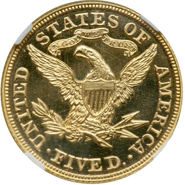 Included in the short roster of other Proofs of this issue are: (1) Scanlon:2334 (Stack’s 10/73), described as "flawless," and bringing $4,400. Later this piece appeared in Bowers' 11/2000 Bass IV:504 where it was graded PCGS Proof 64 (2) Garrett 3/76:430, realized $5,000, possibly reappearing in Bowers 9/95:1418, again as PCGS Proof 64 (3) Carter:683, $13,200 (4) Clapp, Eliasberg, Trompeter (5) Heritage 8/95:7818, PCGS Proof 63 with several lint marks in lower left of reverse, $17,600. The Trompeter coin, not auctioned at the time (only the gold dollars through $4 gold pieces were sold in 1992) later was placed by private treaty. This gorgeous Gem Proof 66 Cameo specimen may even be the Clapp, Eliasberg, and as the Trompeter piece it is reappearing after many years. A candidate for "Finest Known". Pop 1; none finer In fact NGC reports the second finest graded as Pf-64 (PCGS # 88465) .