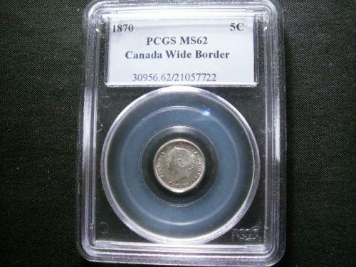 1870 5¢ PCGS MS62. An attractive Minstate Wide border variety. Lots of lustre and white in colour.