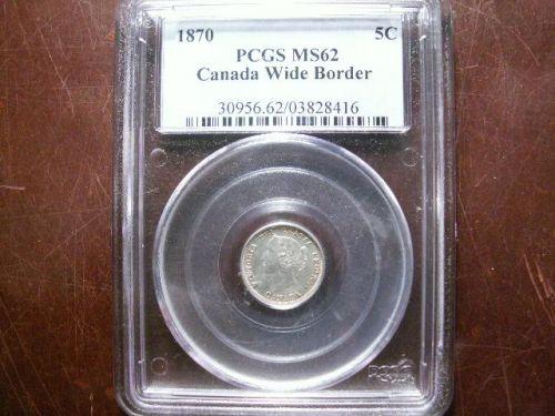 1870 5¢ PCGS MS62. An attractive Minstate Wide border variety. Lots of lustre and white in colour.