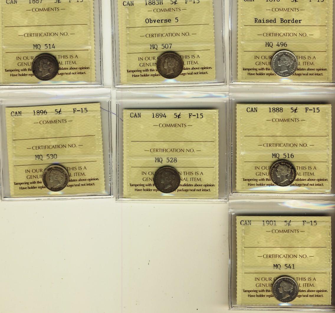 1870 5¢ RB, 1883H Obv 5, 1887, 1888, 1894, 1896 & 1901 all ICCS F15. Lot of 7 coins.
