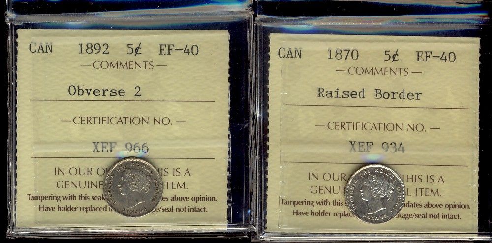 1870 5¢ RB & 1892 Obv 2 ICCS EF40. Lot of 2 coins.